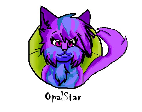 This is OpalStar, she is my cat, Opal is my character in otherwords XD ANYWAYS. . . she has had a hard life, considering she lost her mate to firestar. Her mate WAS scourge, i know what your thinking, WHAT THE HECK?! anyways im a HUGE scourge fan so yea XD hope you like her look, i also kinda changed it to make bloodclan a NORMAl clan, with starclan and stuff so yeppers! hope u like her!
